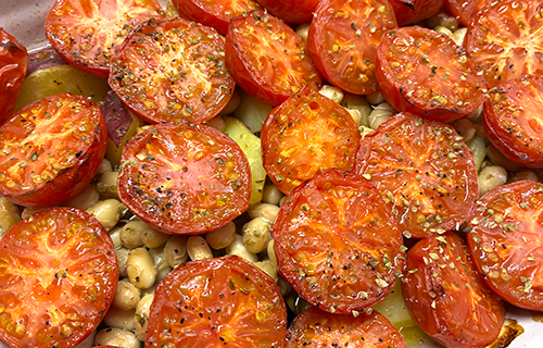 トマトと高相性のじゃがいもと豆を敷き詰めた上に、半割のトマトをこんがりと焼いて、ローズマリーとオレガノを振って焼き上げてみたところ、予想通りの美味しさ。