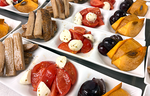 フルーツは、岐阜県産の柿と長野県産のぶどうを添えている。