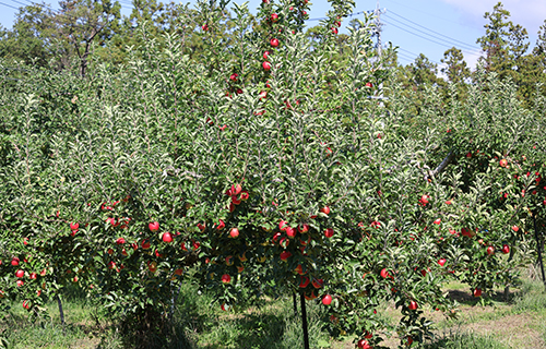 最近は整然と樹が一列に並んでいる圃場が多いが、吉池さんの畑は、なんだか自然発生的だ。