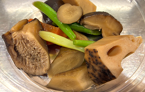5種類以上の野菜と、秋田の齋藤さんの干し椎茸と北海道奥利尻の昆布でとった出汁と醤油、みりん、黒砂糖で煮て、一晩おいたものを提供する。