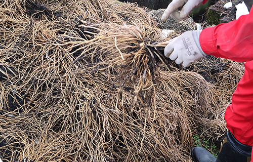 ハウスの前に、何やら根っこの山がある。