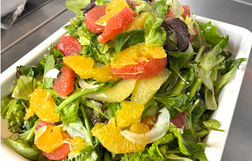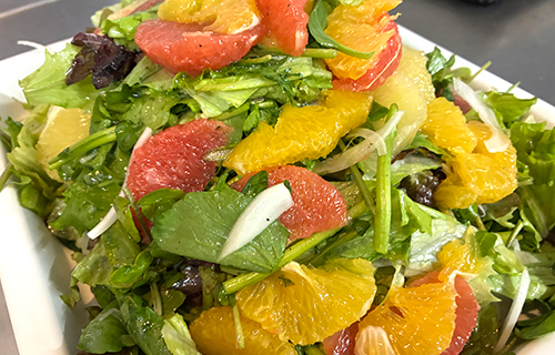 厨房にて、朝、シトラスとクレソンのサラダを仕上げた。