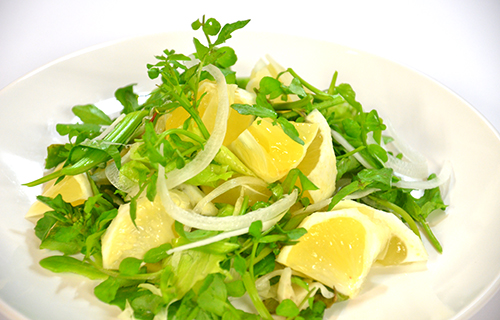 クレソンと新玉ねぎのスライス、柑橘類を混ぜ込み、特製のレモンドレッシングで和える。